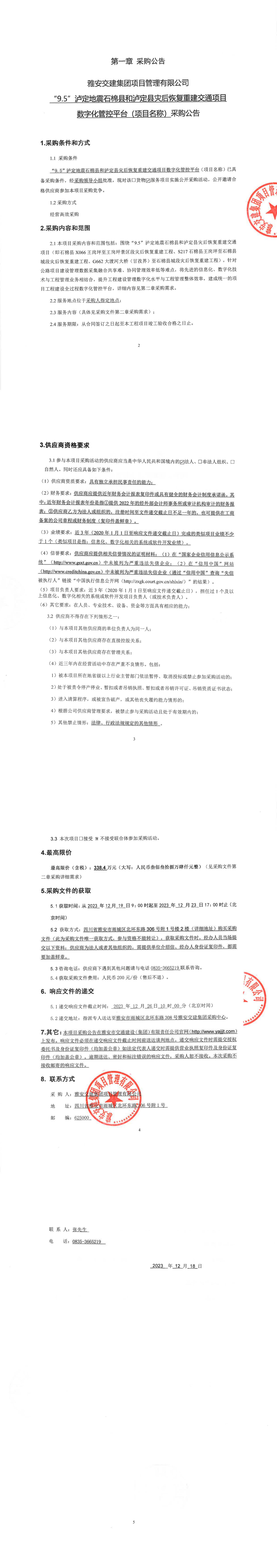 雅安交建集團(tuán)項(xiàng)目管理有限公司“9.5”瀘定地震石棉縣和瀘定縣災(zāi)后恢復(fù)重建交通項(xiàng)目數(shù)字化管控平臺(tái)(項(xiàng)目名稱)采購公告