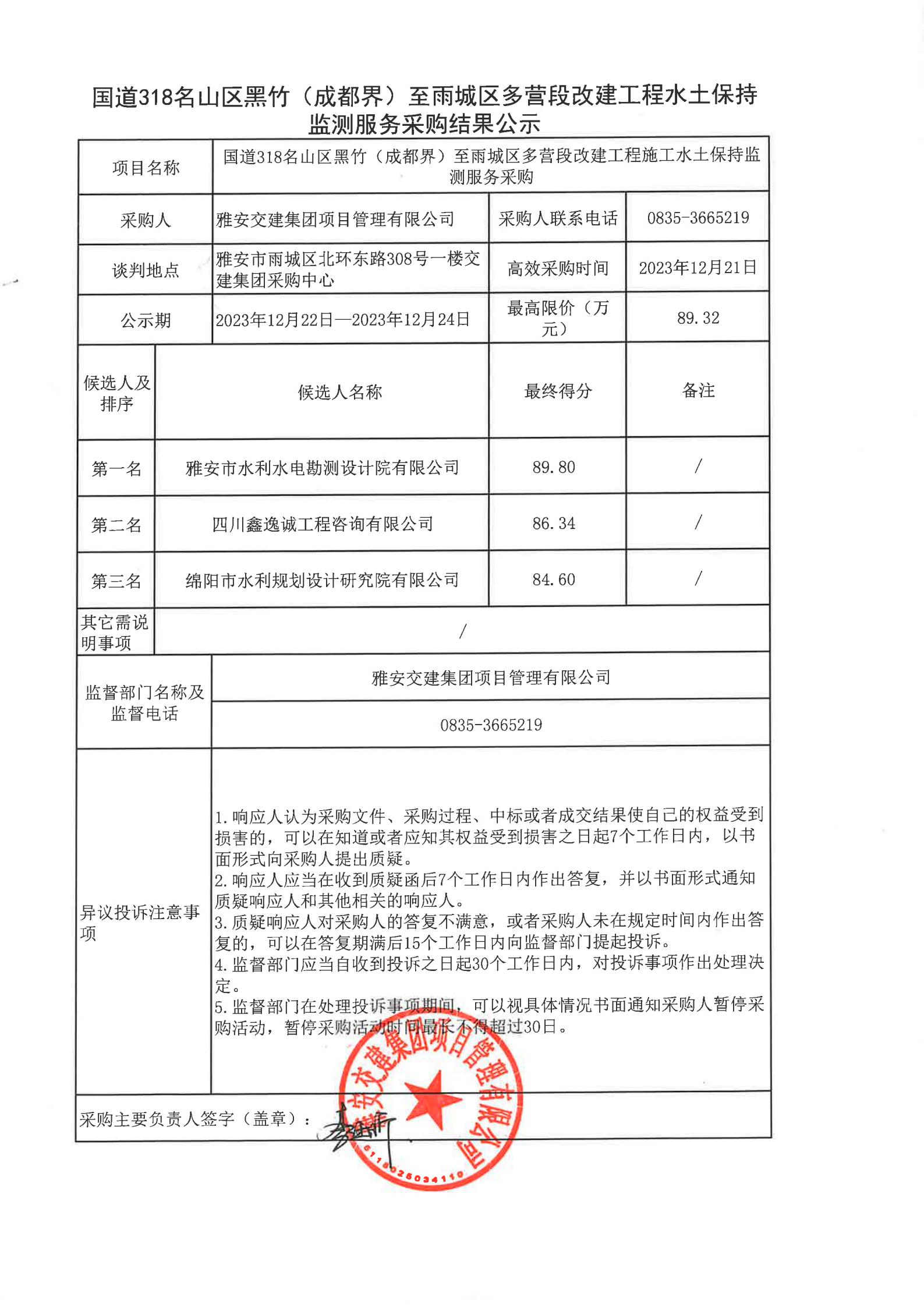 雅安交建集團(tuán)項目管理有限公司國道318名山區(qū)黑竹(成都界)至雨城區(qū)多營段改建工程水土保持監(jiān)測服務(wù)采購結(jié)果公示
