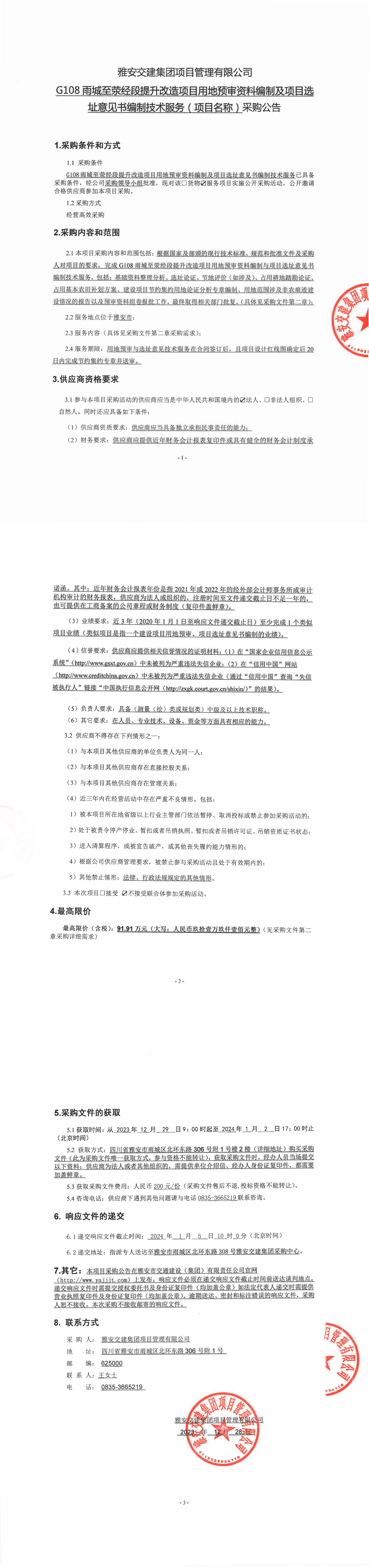 雅安交建集團項目管理有限公司G108雨城至滎經(jīng)段提升改造項目用地預(yù)審資料編制及項目選址意見書編制技術(shù)服務(wù)(項目名稱)采購公告