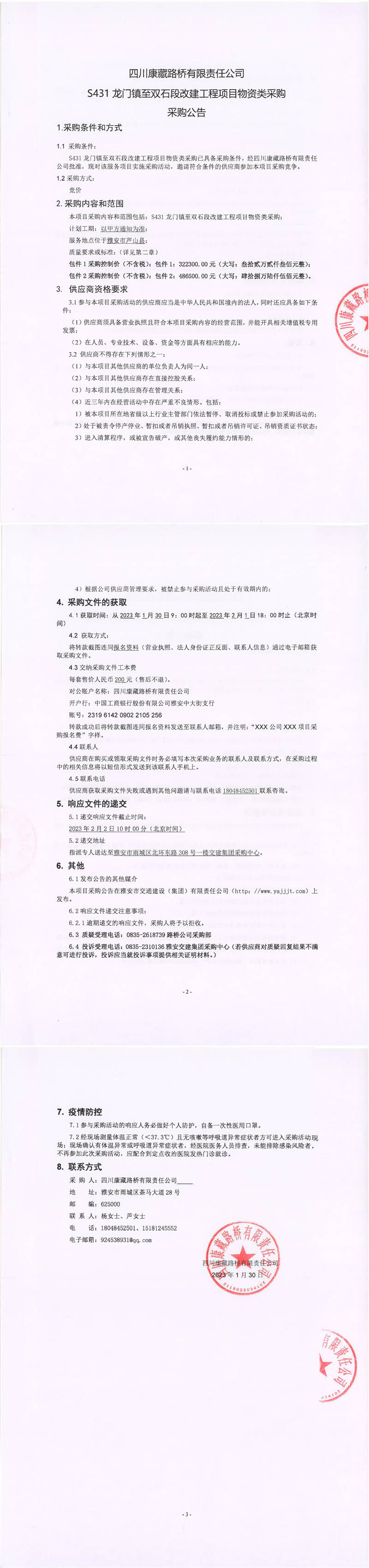 四川康藏路橋有限責(zé)任公司S431龍門鎮(zhèn)至雙石段改建工程項目物資類采購采購公告