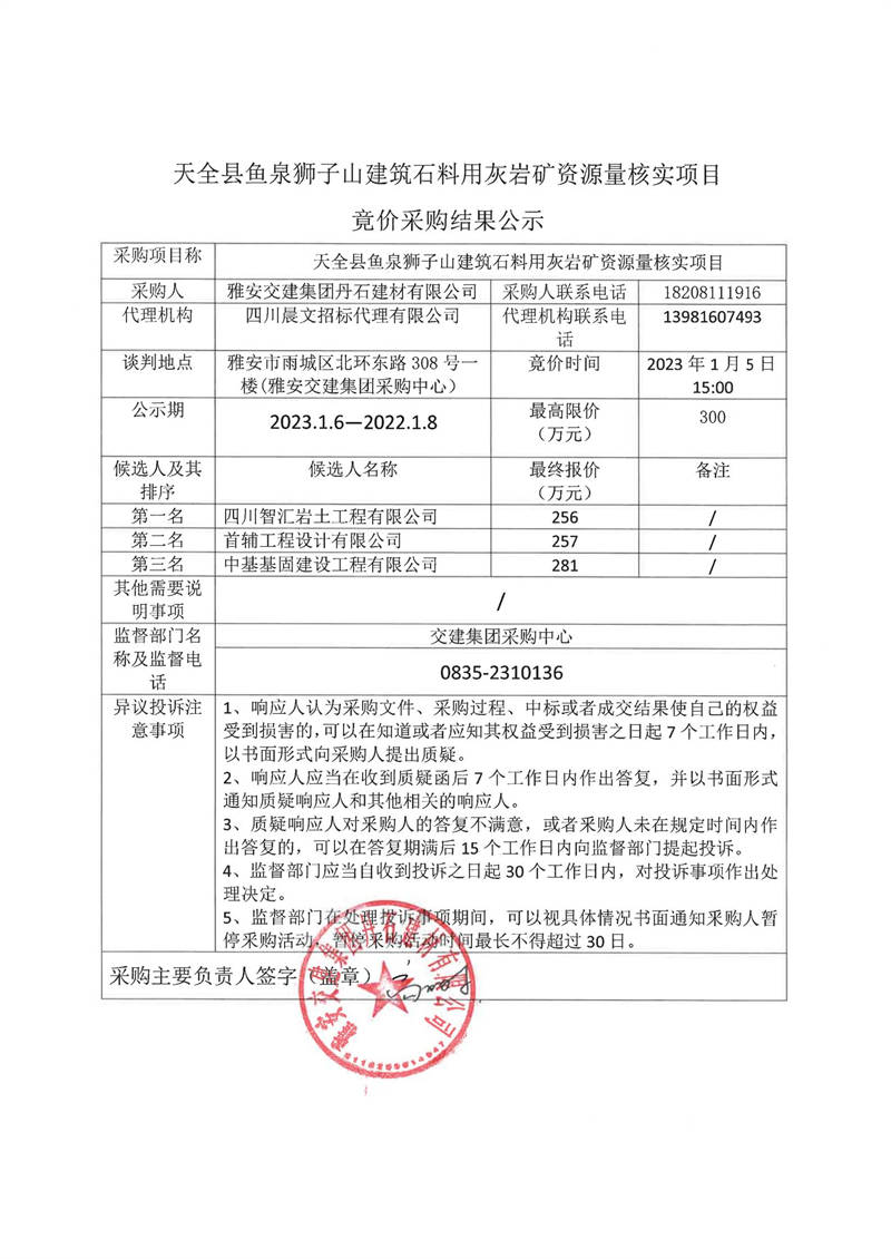 雅安交建集團(tuán)丹石建材有限公司天全縣魚(yú)泉獅子山建筑石料用灰?guī)r礦資源量核實(shí)項(xiàng)目競(jìng)價(jià)采購(gòu)結(jié)果公示