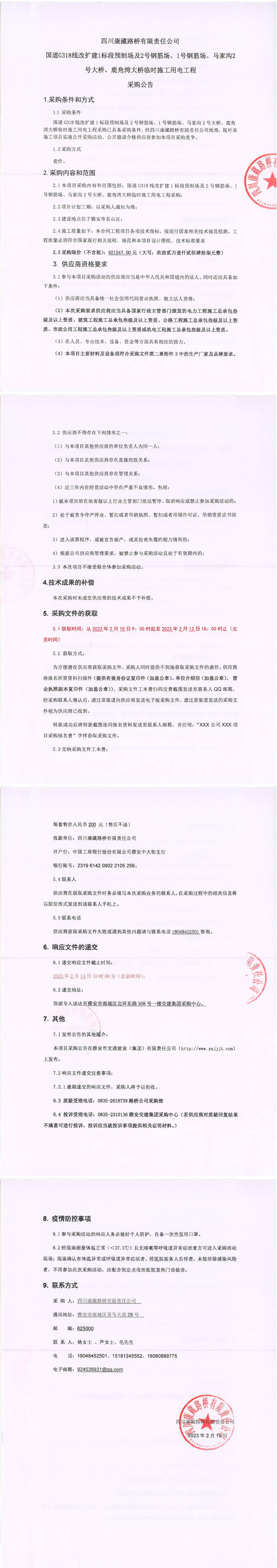 四川康藏路橋有限責(zé)任公司國道G318線改擴(kuò)建1標(biāo)段預(yù)制場及2號鋼筋場、1號鋼筋場、馬家溝2號大橋、鹿角灣大橋臨時(shí)施工用電工程采購公告