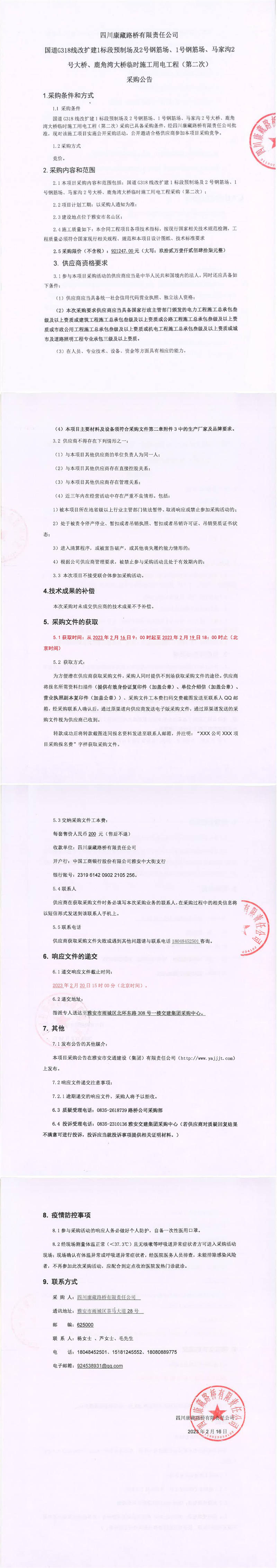 四川康藏路橋有限責(zé)任公司國道G318線改擴(kuò)建1標(biāo)段預(yù)制場及2號鋼筋場、1號鋼筋場、馬家溝2號大橋、鹿角灣大橋臨時施工用電工程(第二次)采購公告