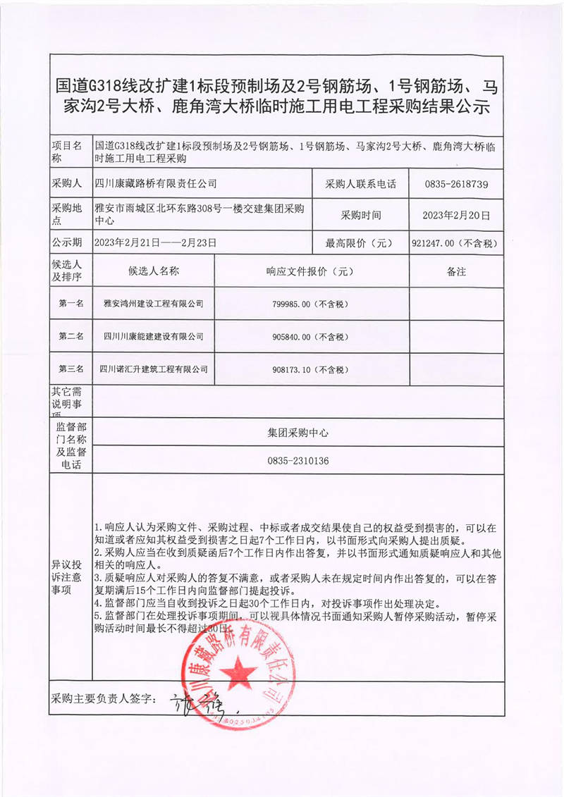 四川康藏路橋有限責(zé)任公司國道318線改擴建1標段預(yù)制場及2號鋼筋場、1號鋼筋場、馬家溝2號大橋、鹿角灣大橋臨時施工用電工程采購結(jié)果公示