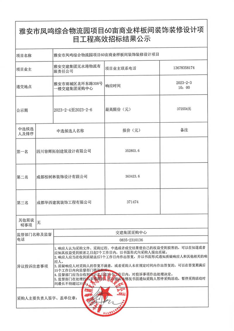 雅安交建集團無水港物流有限責任公司雅安市鳳鳴綜合物流園項目60畝商業(yè)樣板間裝飾裝修設計項目工程高效采購結果公示