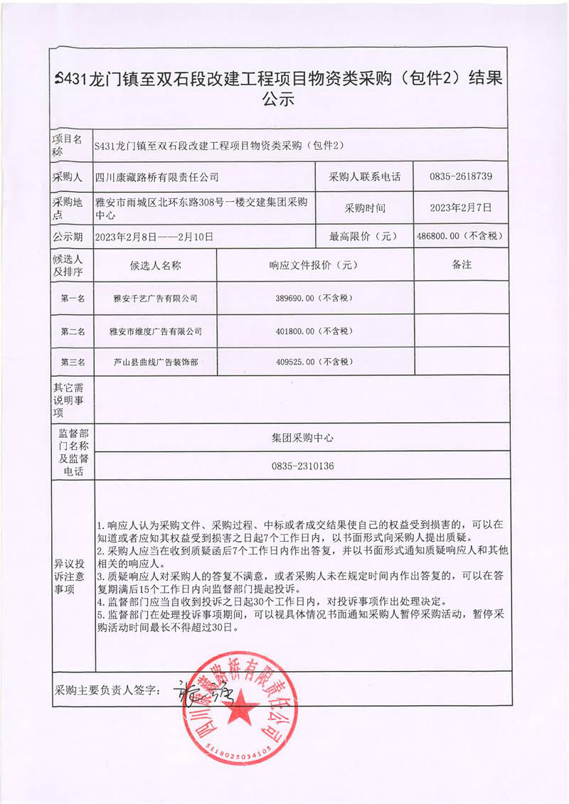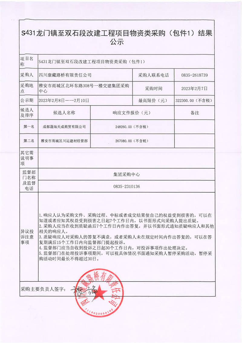 四川康藏路橋有限責(zé)任公司S431龍門鎮(zhèn)至雙石段改建工程項目物資類采購(包件1、包件2)結(jié)果公示