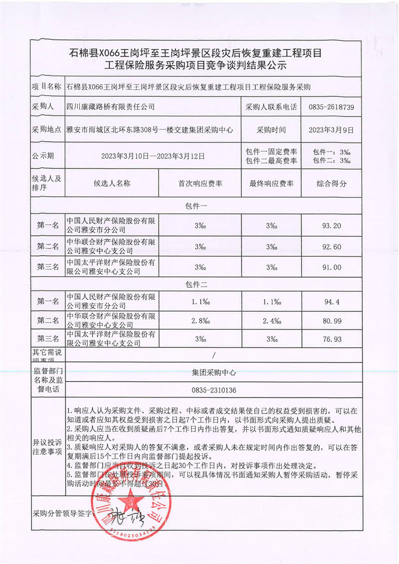 四川康藏路橋有限責(zé)任公司石棉縣X066王崗坪至王崗坪景區(qū)段災(zāi)后恢復(fù)重建工程項目工程保險服務(wù)采購競爭談判結(jié)果公示
