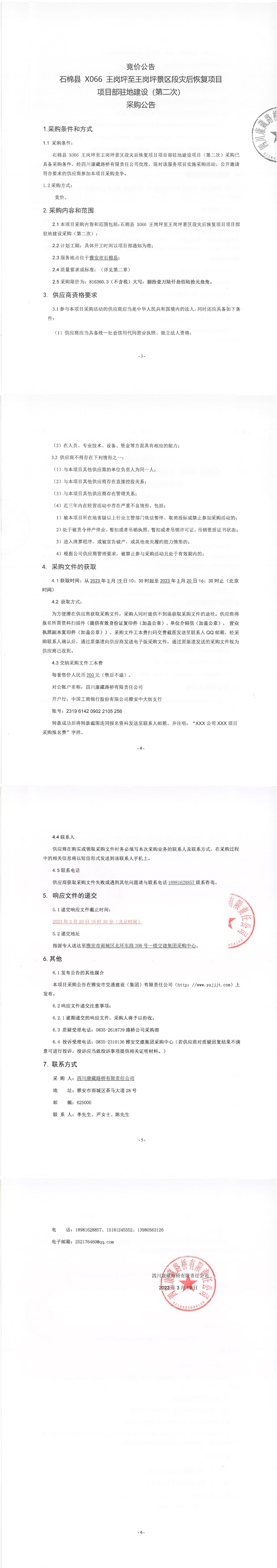 四川康藏路橋有限責任公司石棉縣X066王崗坪至王崗坪景區(qū)段災后恢復項目項目部駐地建設(shè)(第二次)采購公告