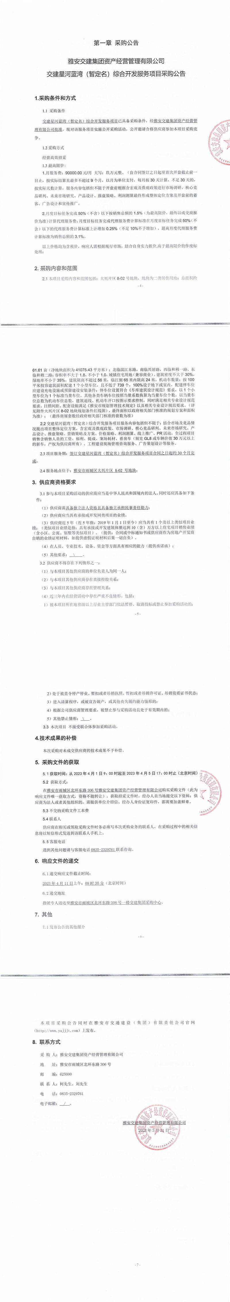 雅安交建集團(tuán)資產(chǎn)經(jīng)營(yíng)管理有限公司交建星河藍(lán)灣(暫定名)綜合開發(fā)服務(wù)項(xiàng)目采購(gòu)公告