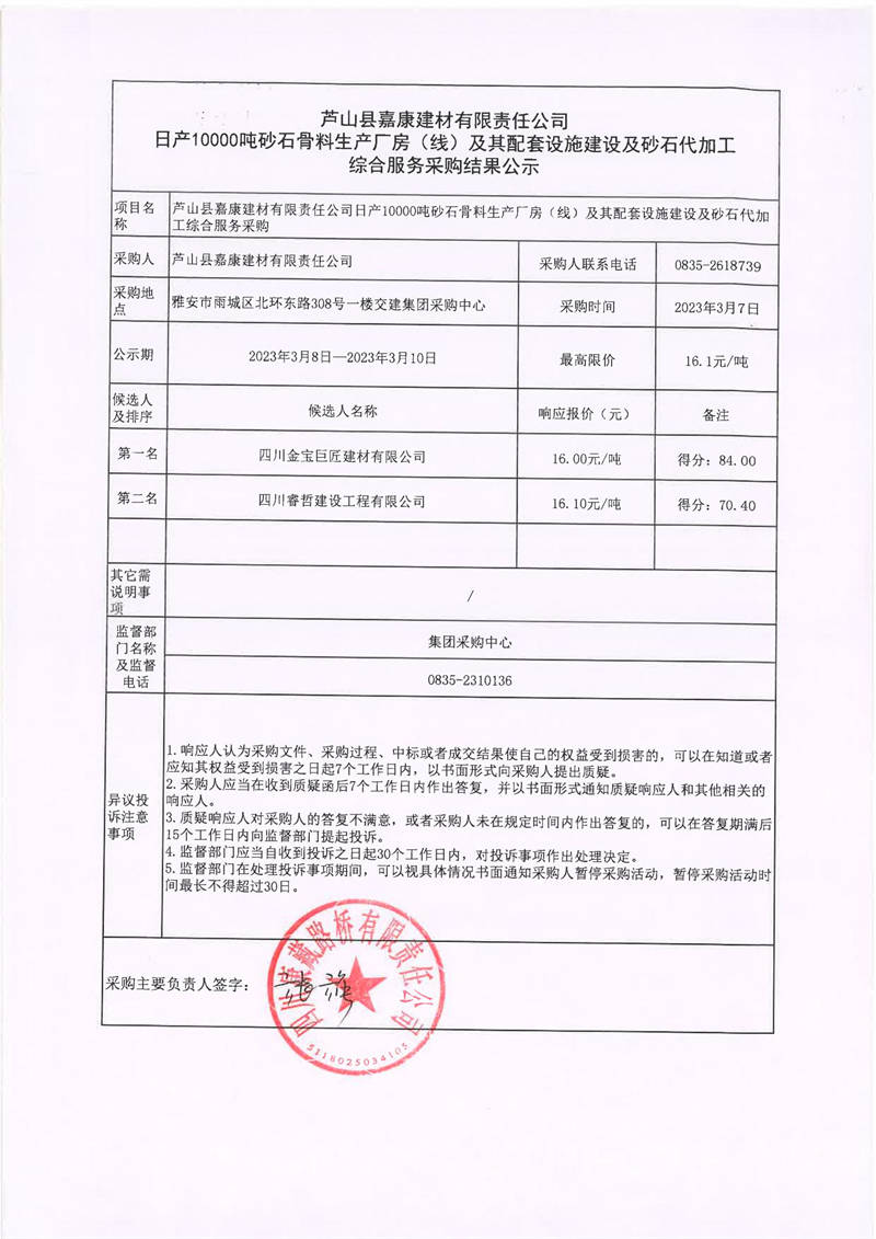 蘆山縣嘉康嘉康建材有限責任公司日產(chǎn)10000噸砂石骨料生產(chǎn)廠房(線)及其配套設(shè)施建設(shè)及砂石代加工綜合服務(wù)采購結(jié)果公示