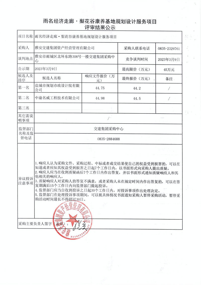 雅安交建集團資產經營管理有限公司雨名經濟走廊·梨花谷康養(yǎng)基地規(guī)劃設計服務項目采購結果公示