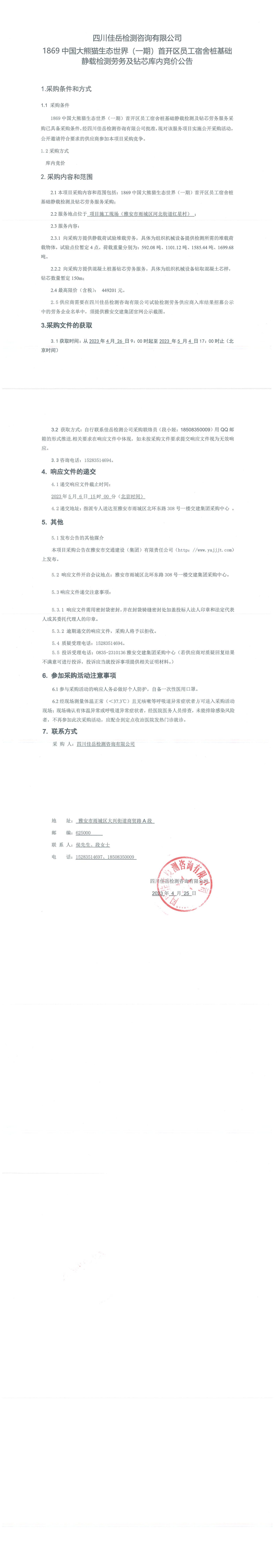 四川佳岳檢測咨詢有限公司1869中國大熊貓生態(tài)世界(一期)首開區(qū)員工宿舍樁基礎靜載檢測勞務及磚芯庫內(nèi)競價公告