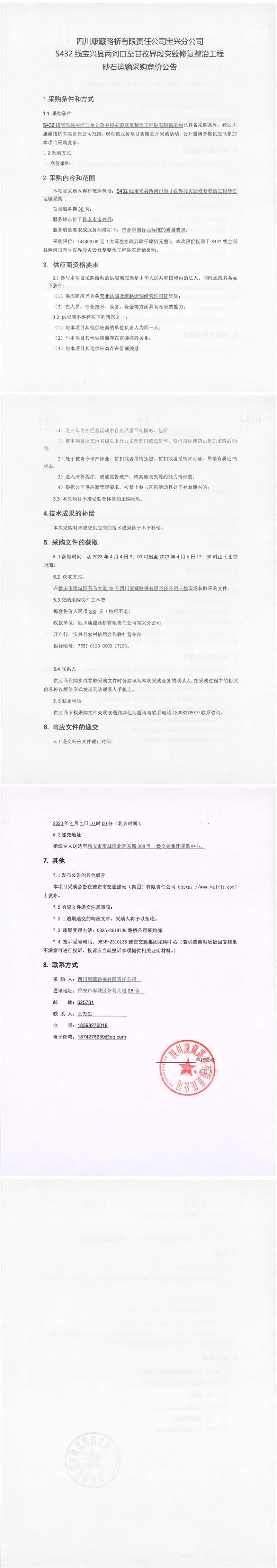 四川康藏路橋有限責(zé)任公司寶興分公司S432寶興縣兩河口至甘孜界段災(zāi)毀修復(fù)整治工程砂石運(yùn)輸采購(gòu)競(jìng)價(jià)公告