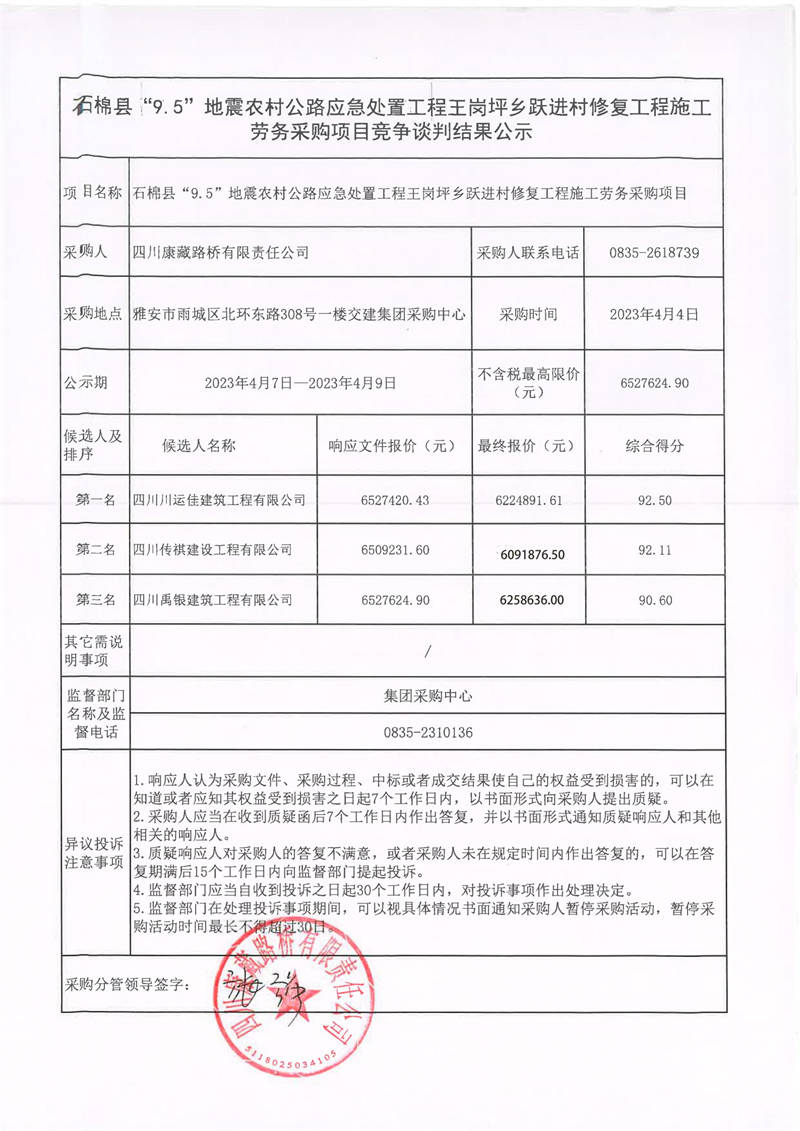 四川康藏路橋有限責(zé)任公司石棉縣“9.5”地震農(nóng)村公路應(yīng)急處置工程王崗坪鄉(xiāng)躍進(jìn)村修復(fù)工程施工勞務(wù)采購(gòu)項(xiàng)目競(jìng)爭(zhēng)談判結(jié)果公示