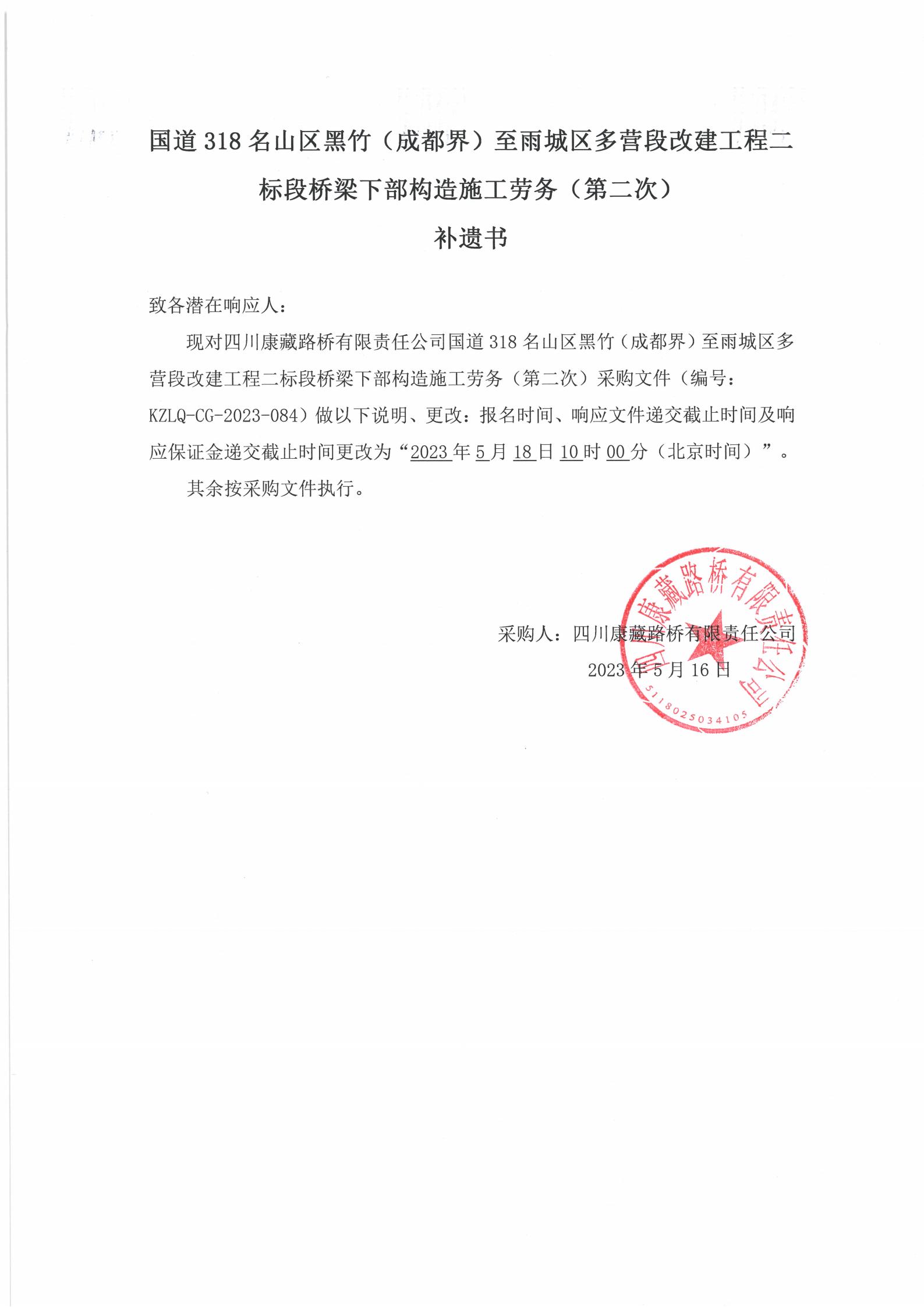 四川康藏路橋有限責(zé)任公司國(guó)道318名山區(qū)黑竹(成都界)至雨城區(qū)多營(yíng)段改建工程二標(biāo)段橋梁下部構(gòu)造施工勞務(wù)(第二次)補(bǔ)遺書(shū)