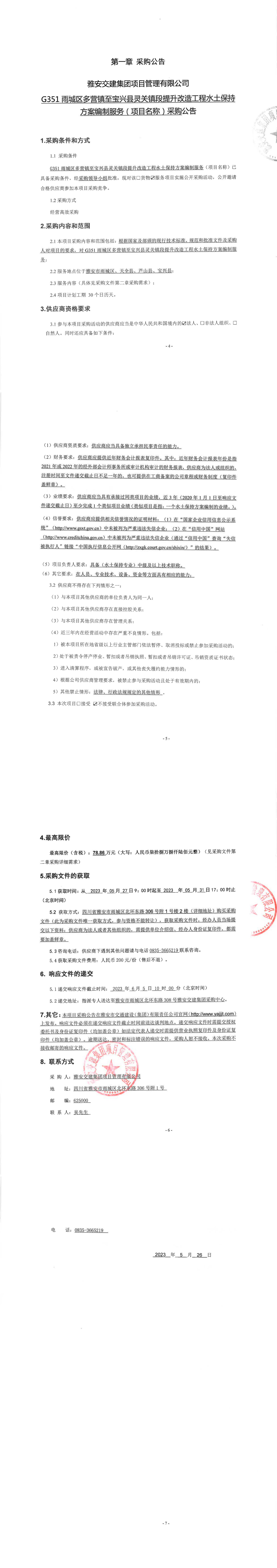 雅安交建集團項目管理有限公司G351雨城區(qū)多營鎮(zhèn)至寶興縣靈關(guān)鎮(zhèn)段提升改造工程水土保持方案編制服務(wù)(項目名稱)采購公告