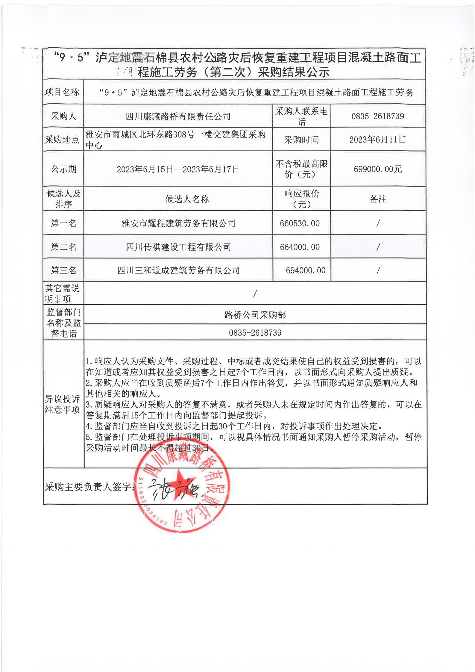 四川康藏路橋有限責(zé)任公司“9·5”瀘定地震石棉縣農(nóng)村公路災(zāi)后恢復(fù)重建工程項(xiàng)目混凝土路面工程施工勞務(wù)采購(gòu)(第二次)結(jié)果公示