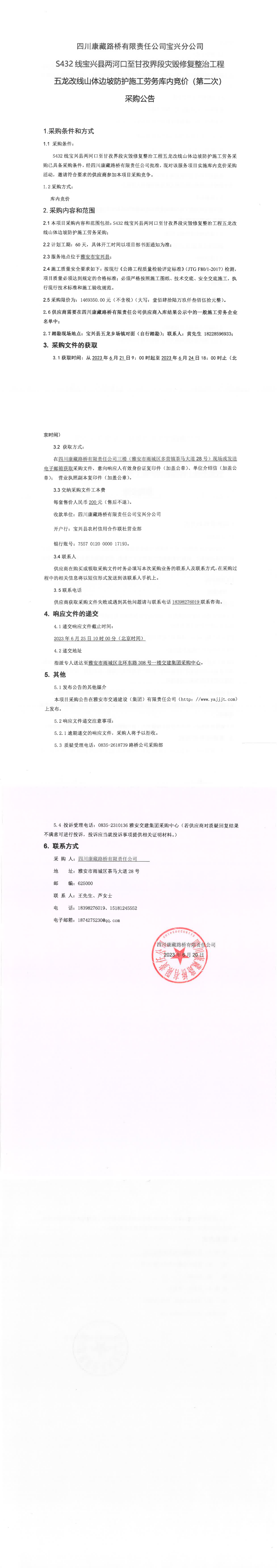 四川康藏路橋有限責(zé)任公司寶興分公司S432線寶興縣兩河口至甘孜界段災(zāi)毀修復(fù)整治工程五龍改線山體邊坡防護(hù)施工勞務(wù)庫(kù)內(nèi)競(jìng)價(jià)(第二次)采購(gòu)公告
