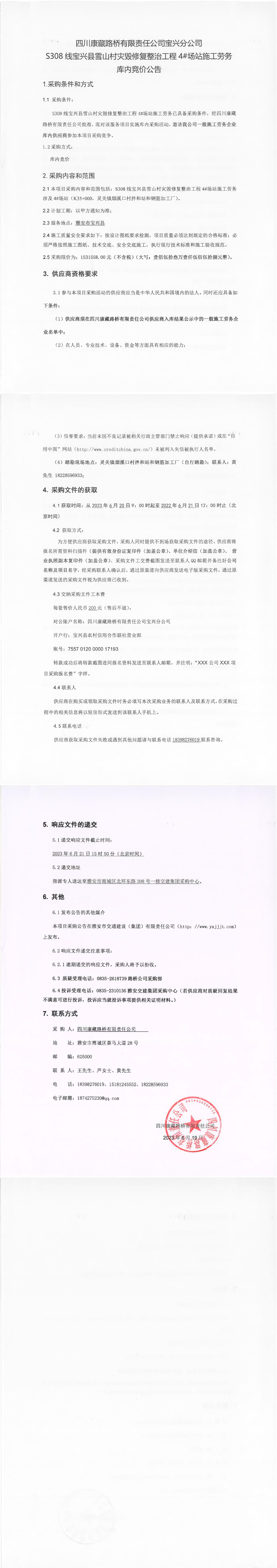 四川康藏路橋有限責(zé)任公司寶興分公司S308線寶興縣雪山村災(zāi)毀整治工程4#場站施工勞務(wù)庫內(nèi)競價公告