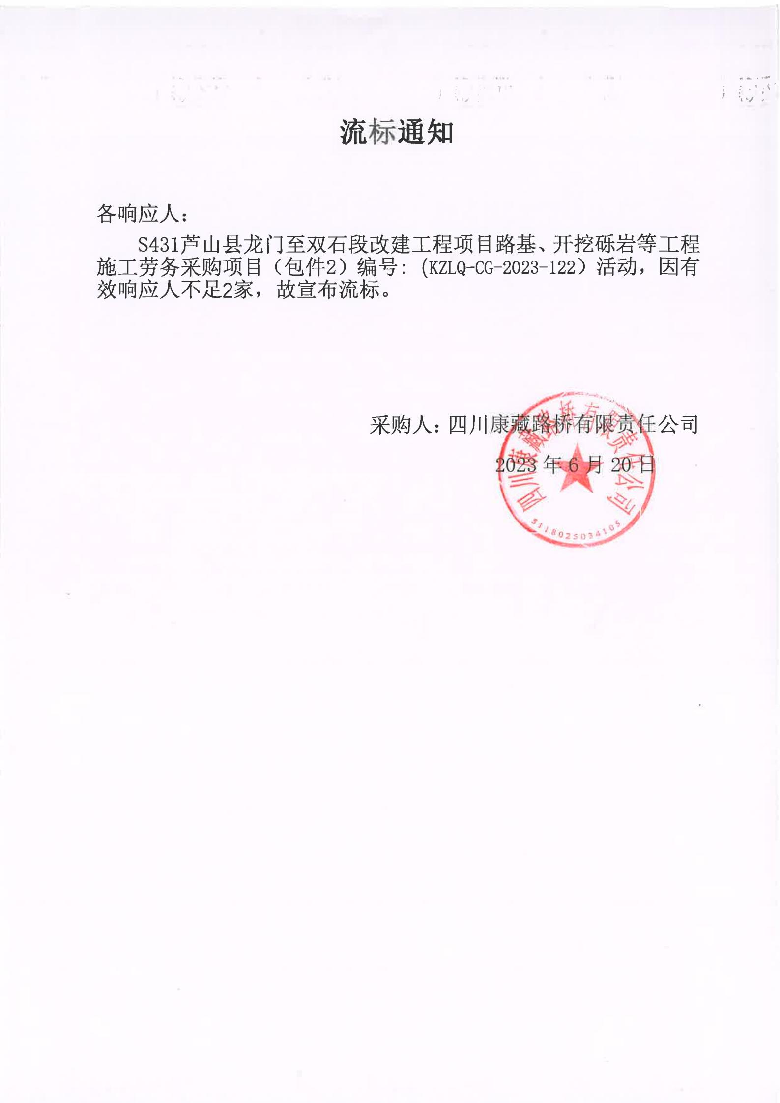 四川康藏路橋有限責任公司S431蘆山縣龍門至雙石段改建工程項目路基、開挖礫巖等工程施工勞務(wù)采購(包件2)流標通知