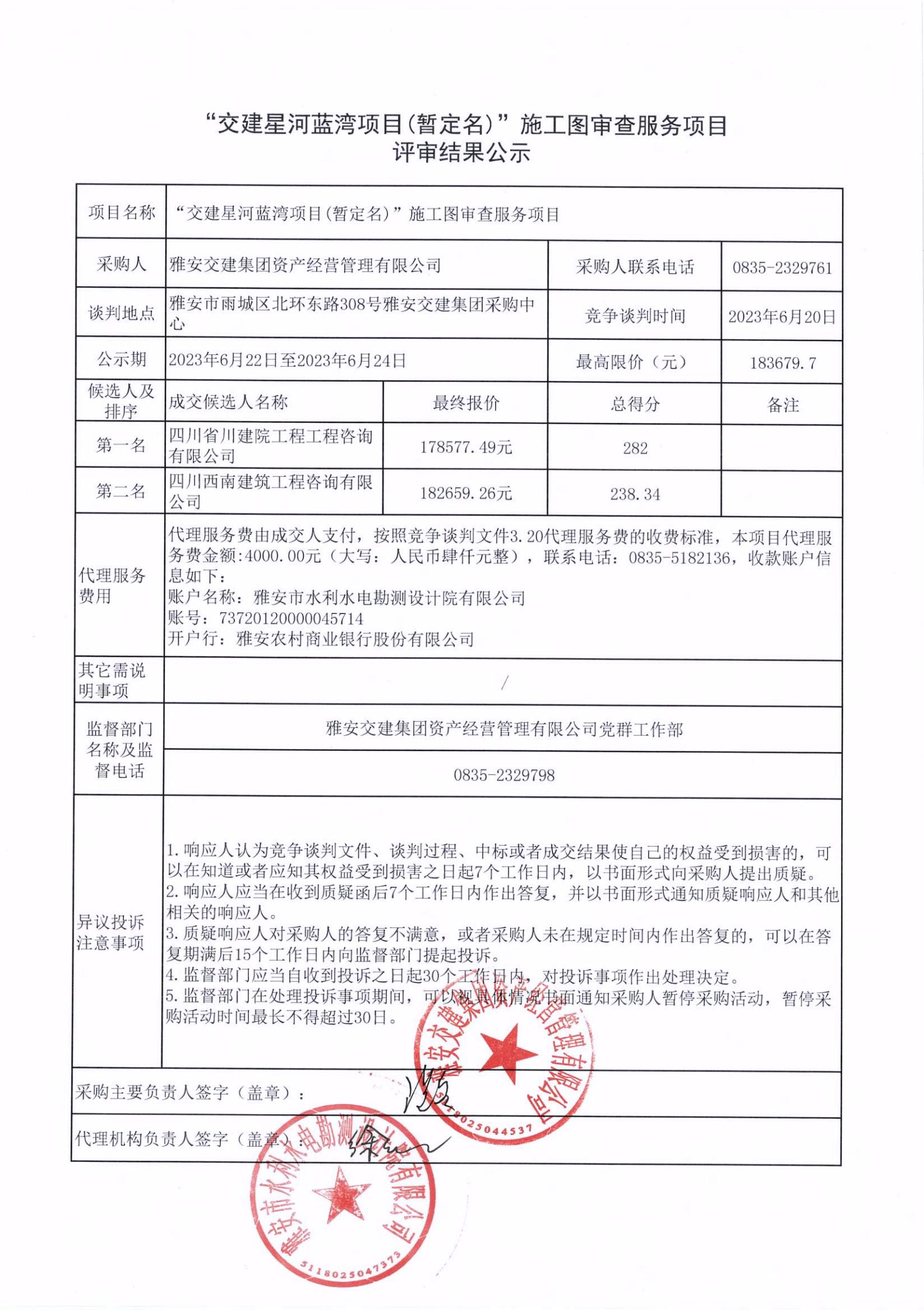 雅安交建集團資產(chǎn)經(jīng)營管理有限公司“交建星河藍灣項目(暫定名)”施工圖審查服務項目評審結(jié)果公示
