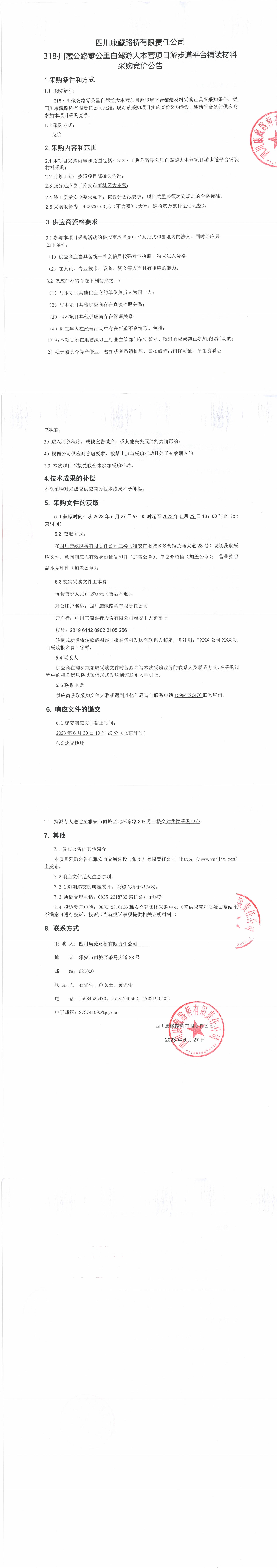 四川康藏路橋有限責(zé)任公司318·川藏公路零公里自駕游大本營項目步游道平臺鋪裝材料采購競價公告