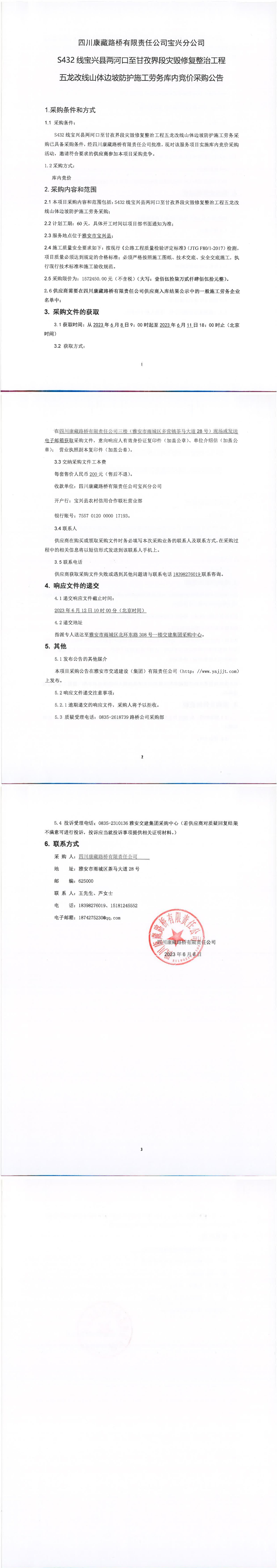 四川康藏路橋有限責任公司S432線寶興縣兩河口至甘孜界段災毀修復整治工程五龍改線山體邊坡防護施工勞務庫內(nèi)競價采購公告