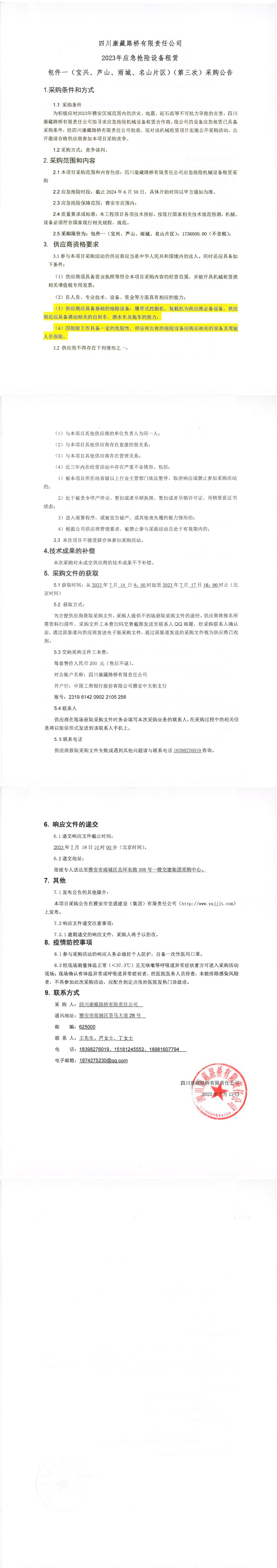 四川康藏路橋有限責任公司2023年應急搶險設備租賃包件一(寶興、蘆山、雨城、名山片區(qū))(第三次)采購公告