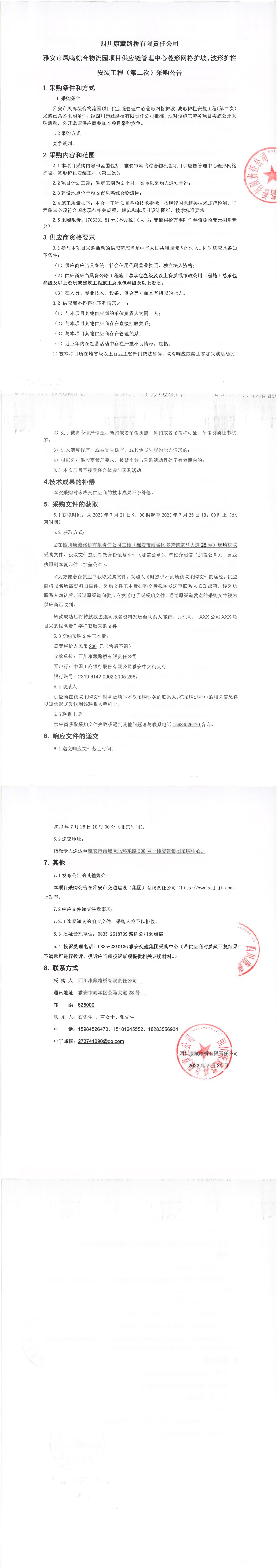 四川康藏路橋有限責(zé)任公司雅安市鳳鳴綜合物流園項(xiàng)目供應(yīng)鏈管理中心菱形網(wǎng)格護(hù)坡、波形護(hù)欄安裝工程(第二次)采購(gòu)公告
