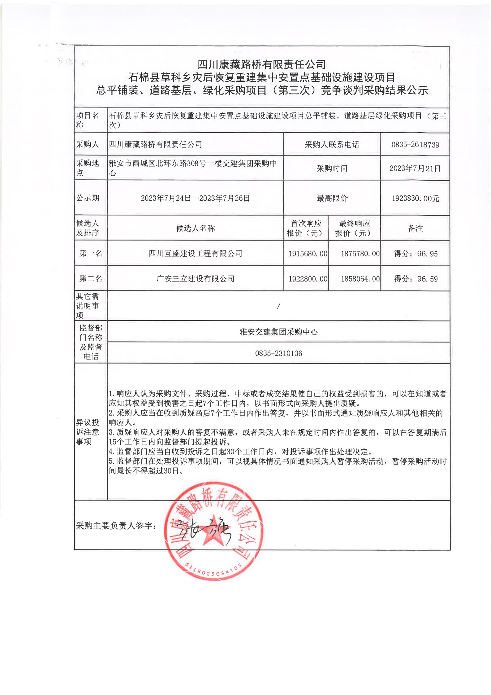 四川康藏路橋有限責任公司石棉縣草科鄉(xiāng)災后恢復重建集中安置點基礎設施建設項目總平鋪裝、道路基層、綠化采購項目(第三次)競爭談判采購結果公示