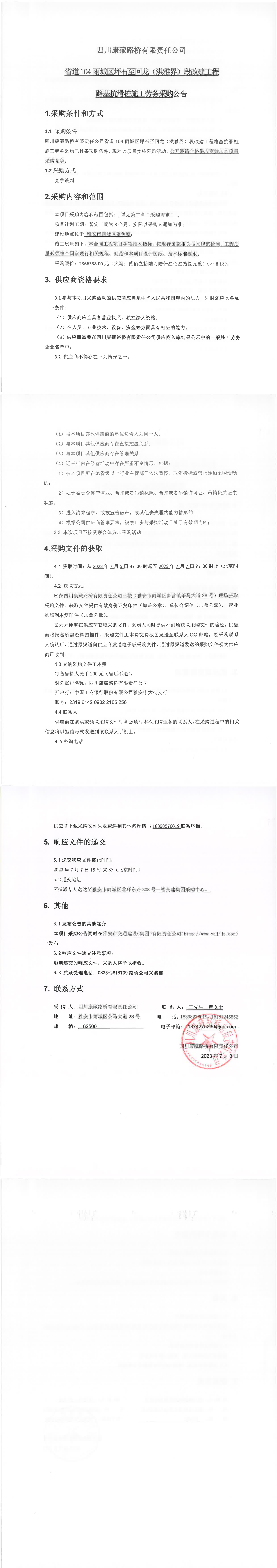 四川康藏路橋有限責(zé)任公司省道104雨城區(qū)坪石至回龍(洪雅界)段改建工程路基抗滑樁施工勞務(wù)采購(gòu)公告
