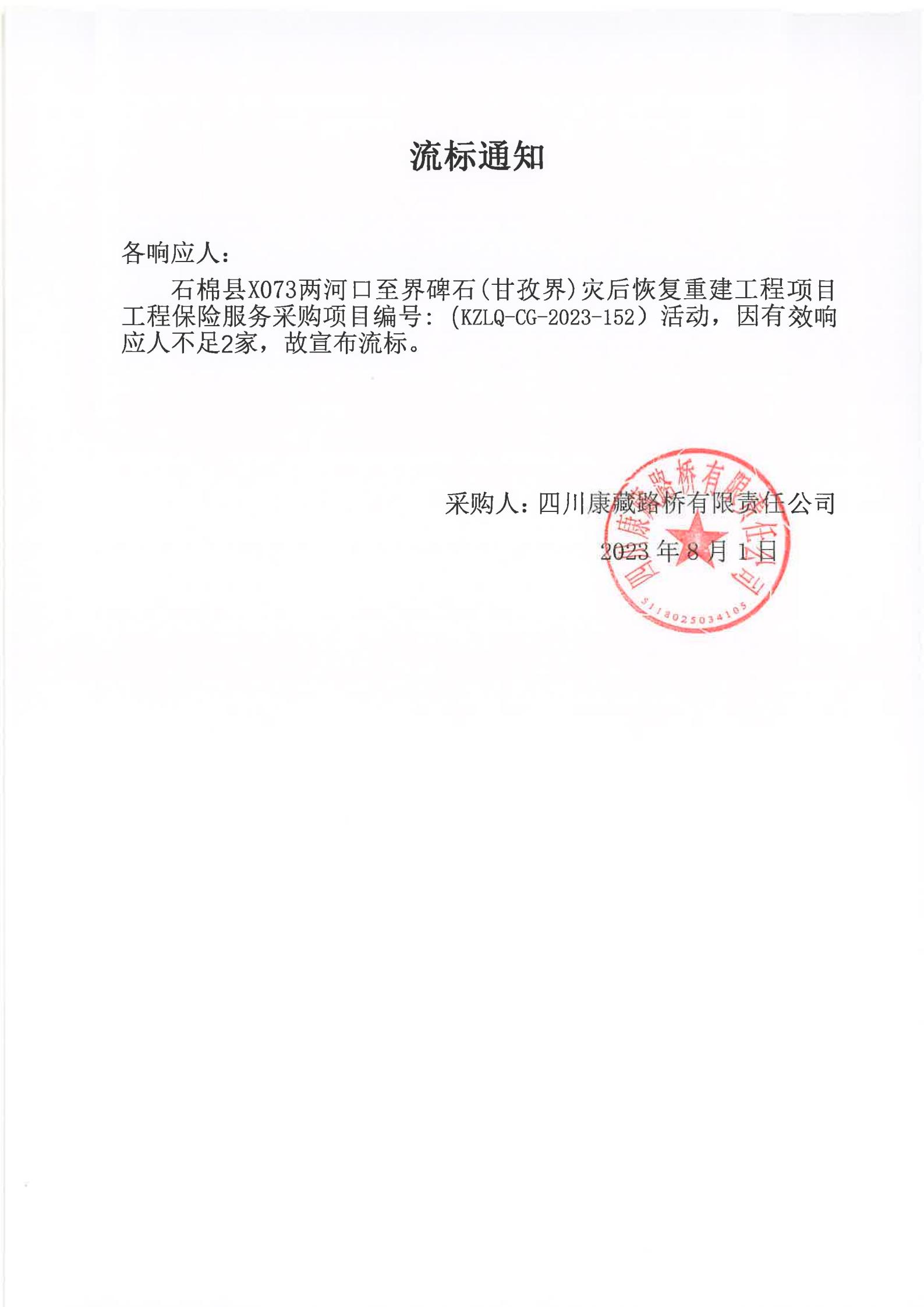 四川康藏路橋有限責任公司石棉分公司石棉縣X073兩河口至界碑石(甘孜界)災后恢復重建工程項目工程保險服務(wù)采購項目流標通知
