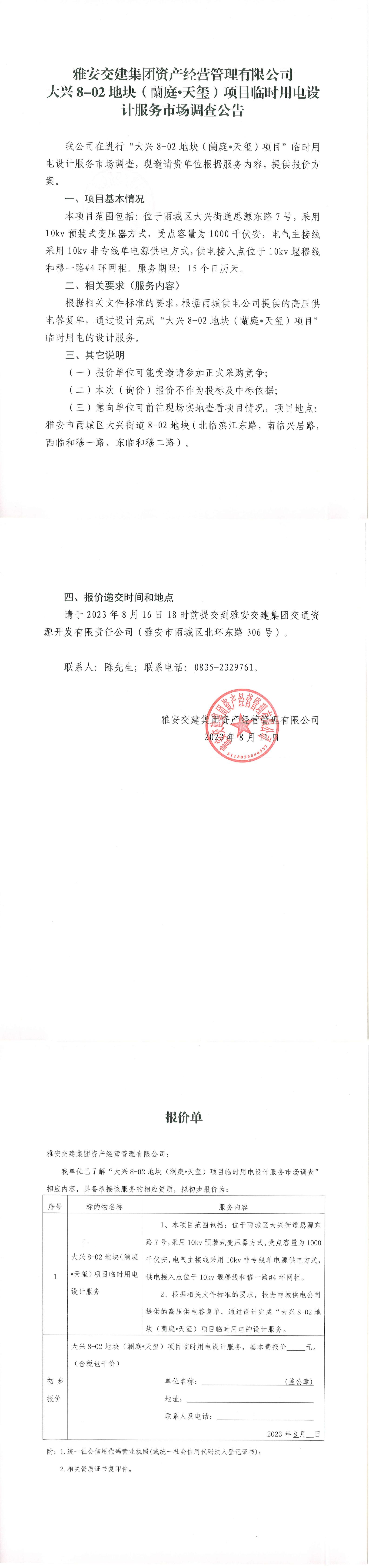 雅安交建集團(tuán)資產(chǎn)經(jīng)營管理有限公司大興8-02地塊(蘭庭·天璽)項(xiàng)目臨時(shí)用電設(shè)計(jì)服務(wù)市場(chǎng)調(diào)查公告