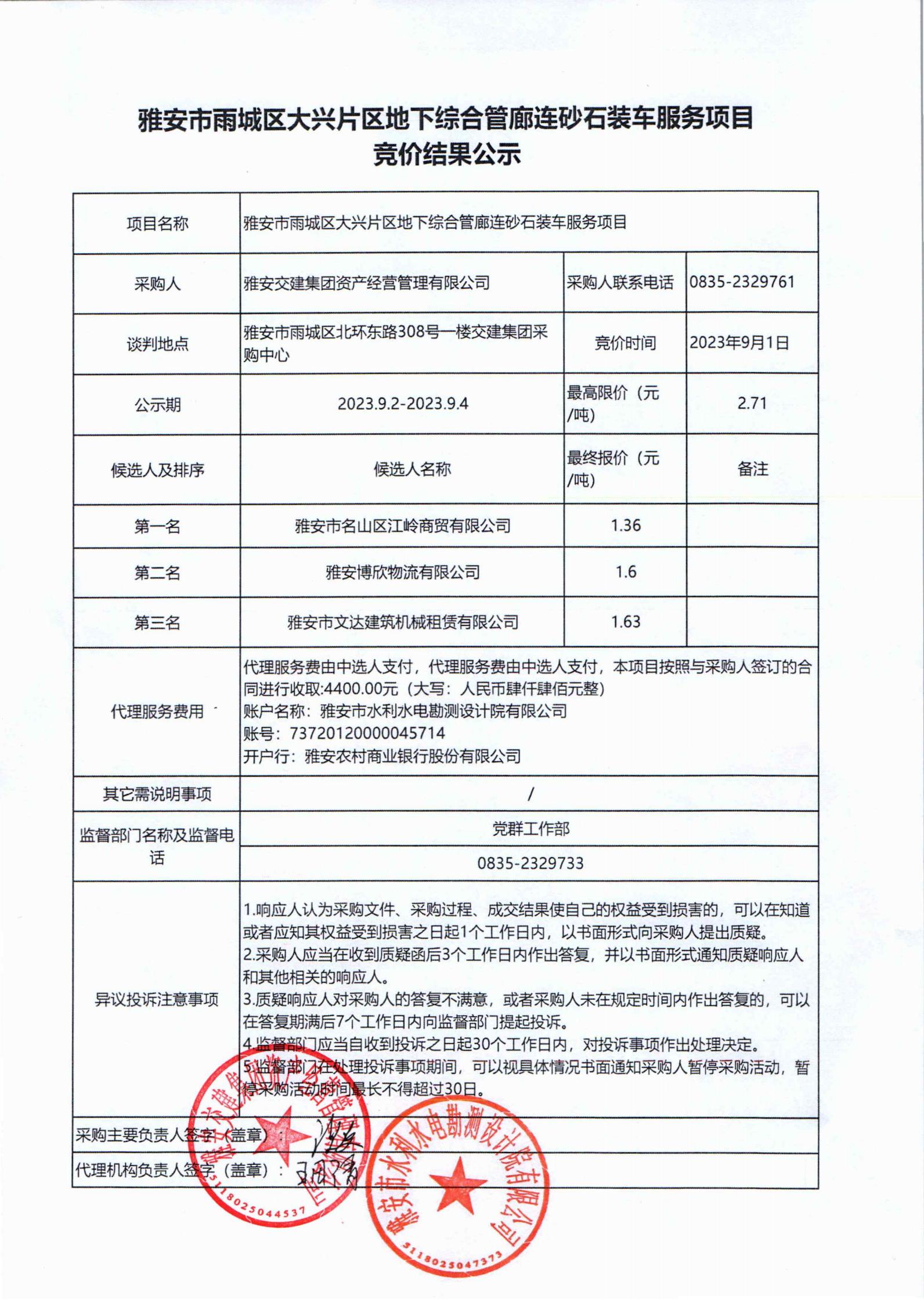 雅安交建集團(tuán)資產(chǎn)經(jīng)營管理有限公司大興片區(qū)地下綜合管廊連砂石裝車服務(wù)項目競價結(jié)果公示