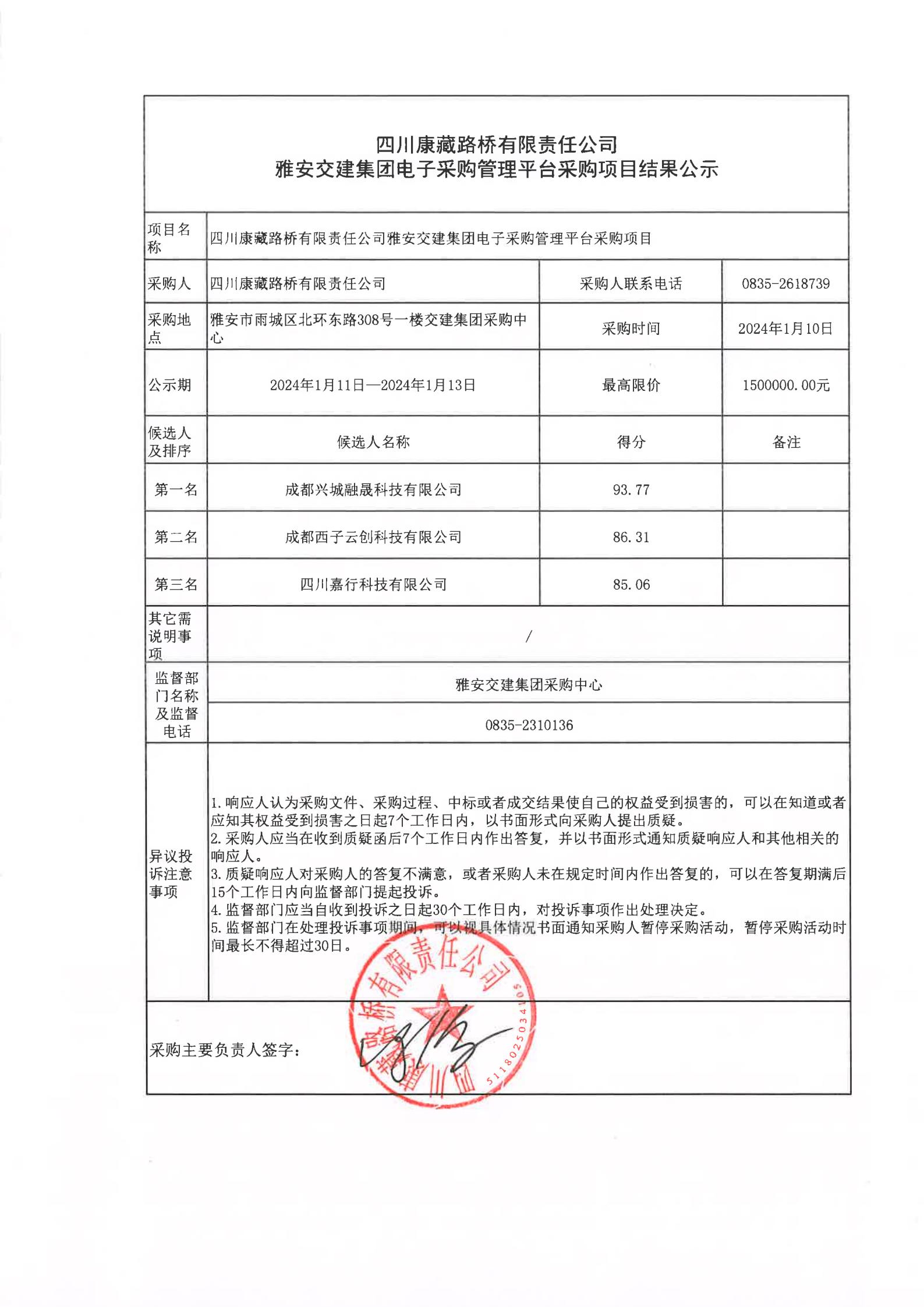 四川康藏路橋有限責(zé)任公司雅安交建集團(tuán)電子采購(gòu)管理平臺(tái)采購(gòu)項(xiàng)目結(jié)果公示