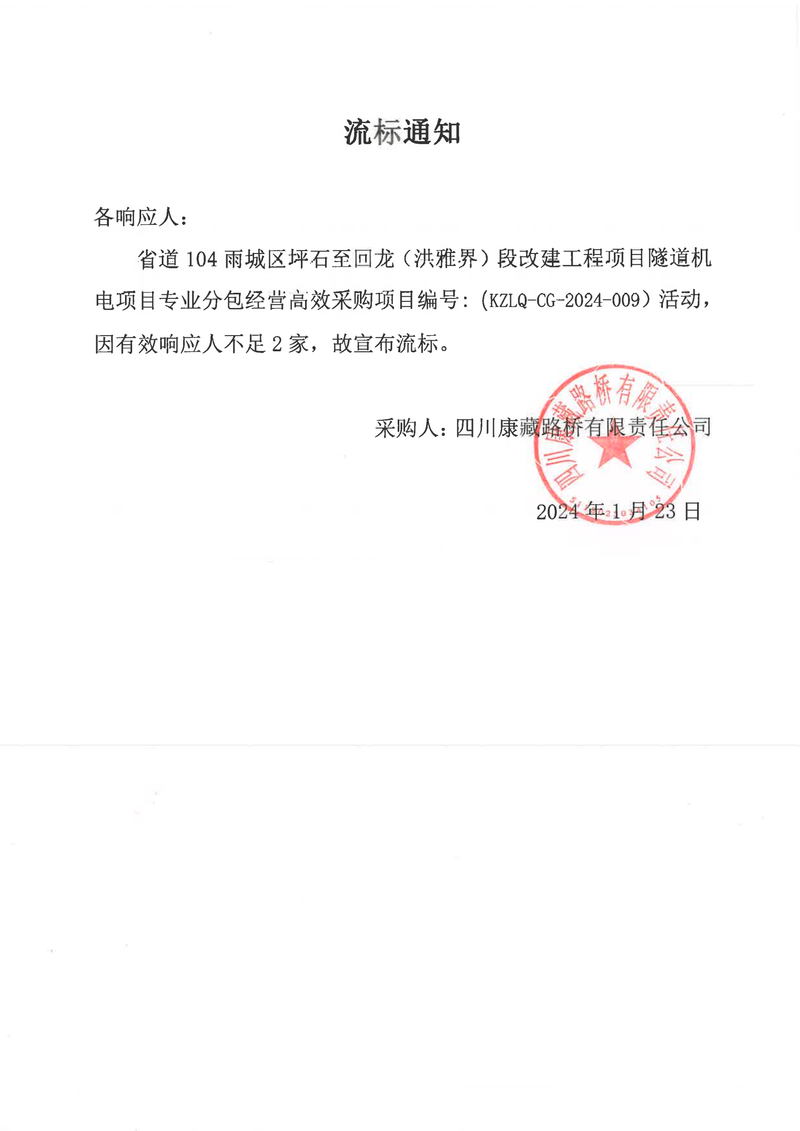四川康藏路橋有限責(zé)任公司省道104雨城區(qū)坪石至回龍(洪雅界)段改建工程項目隧道機電項目專業(yè)分包經(jīng)營高效采購流標(biāo)通知