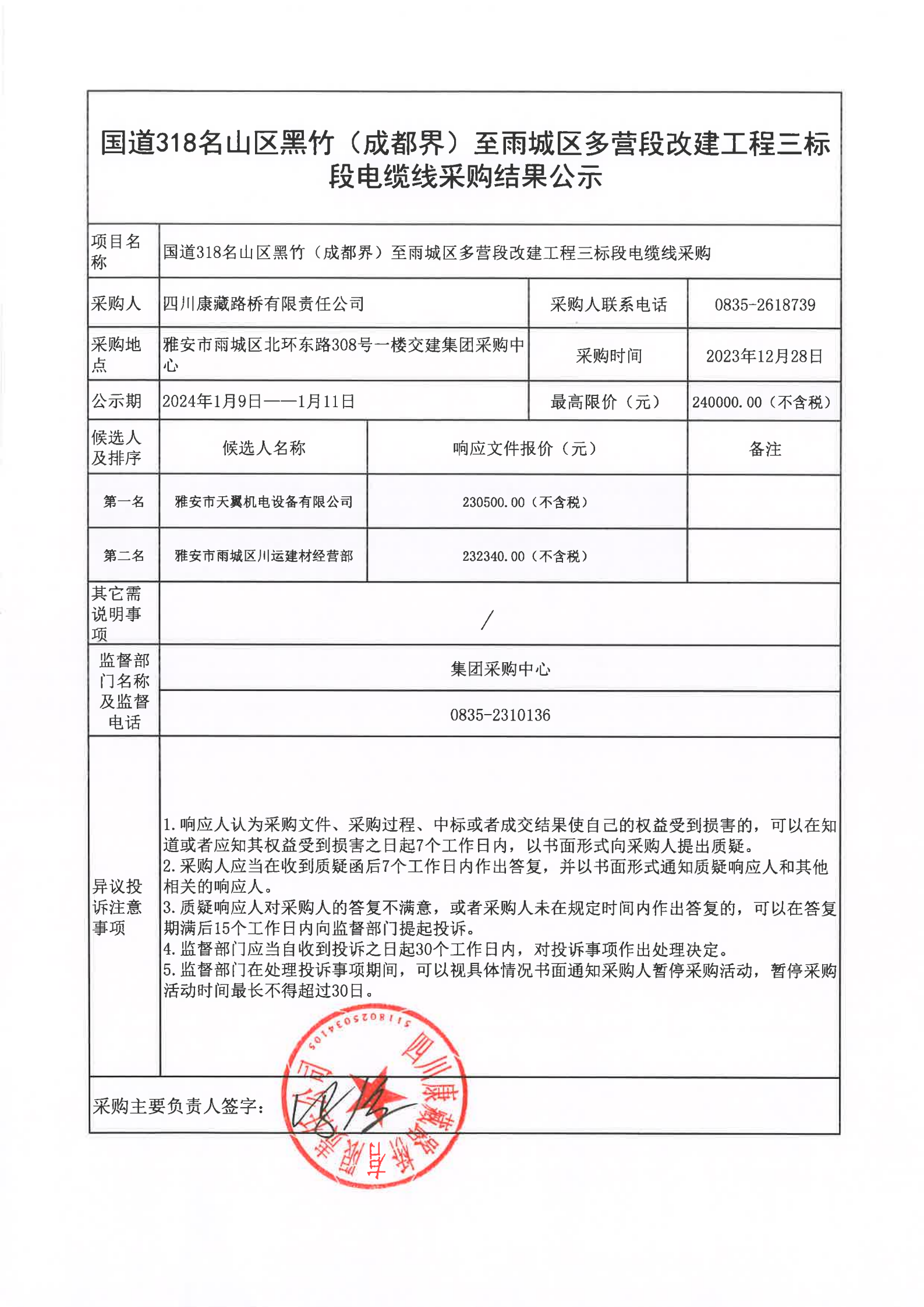 四川康藏路橋有限責(zé)任公司國道318名山區(qū)黑竹(成都界)至雨城區(qū)多營(yíng)段改建工程三標(biāo)段電纜線采購結(jié)果公示