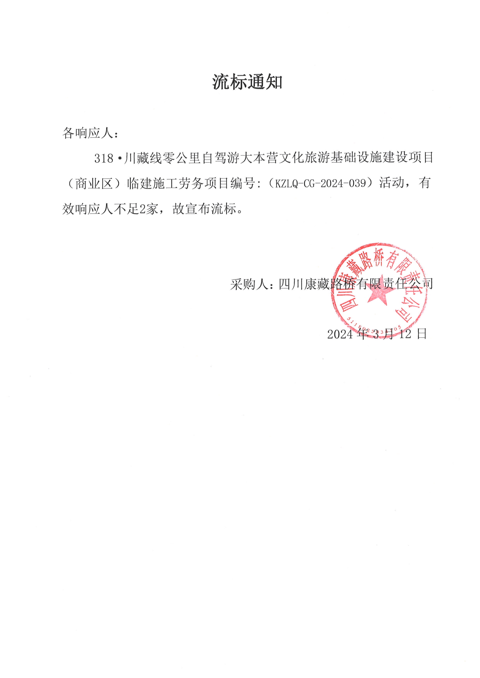 四川康藏路橋有限責(zé)任公司318·川藏線(xiàn)零公里自駕游大本營(yíng)文化旅游基礎(chǔ)設(shè)施建設(shè)項(xiàng)目(商業(yè)區(qū))臨建施工勞務(wù)流標(biāo)通知