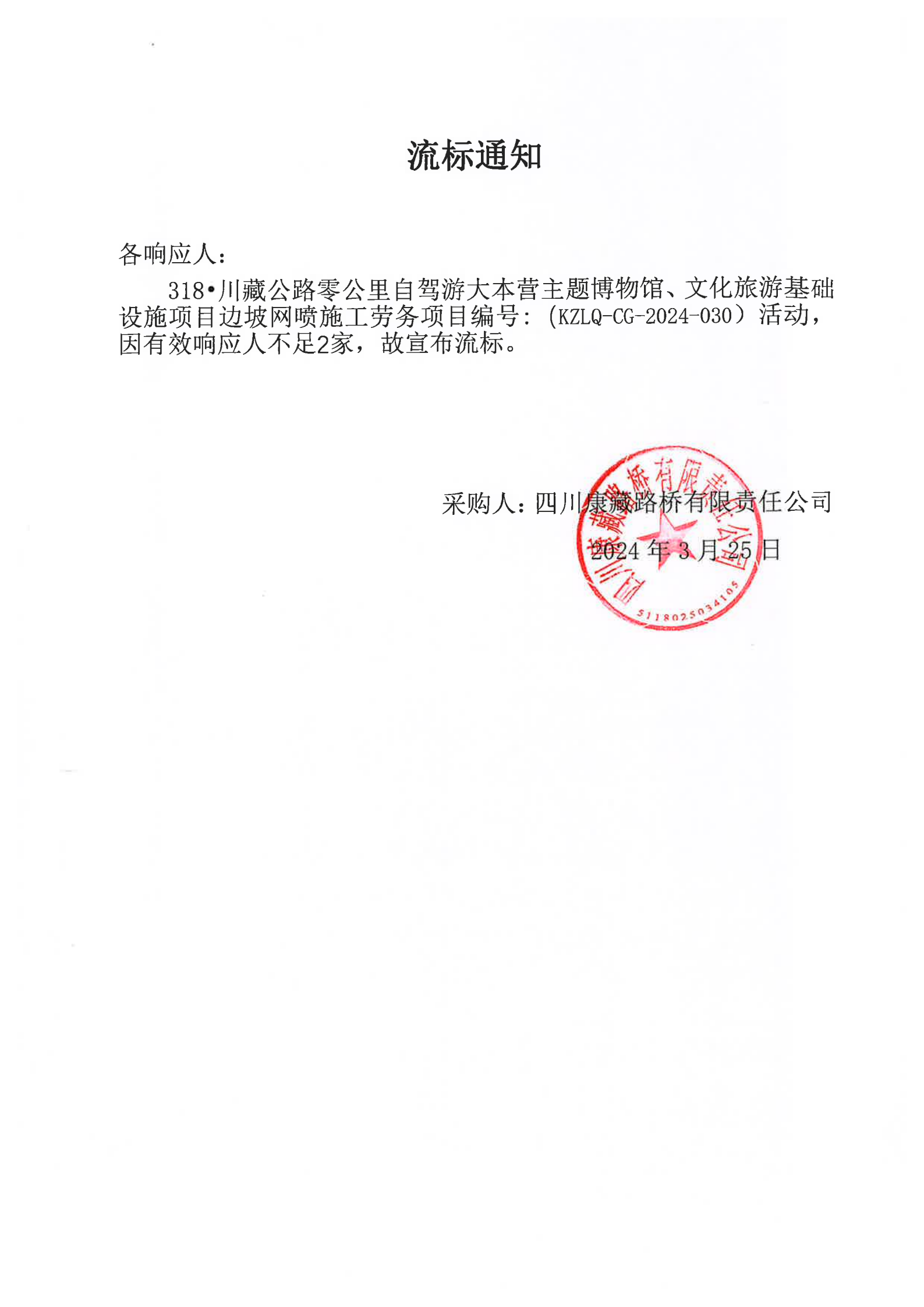 四川康藏路橋有限責任公司318·川藏公路零公里自駕游大本營主題博物館、文化旅游基礎(chǔ)設(shè)施項目邊坡網(wǎng)噴施工勞務(wù)流標通知