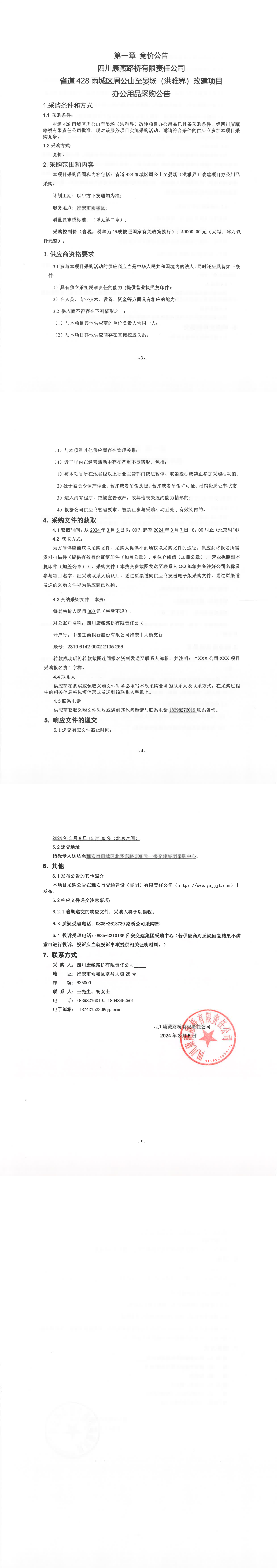 四川康藏路橋有限責任公司省道428雨城區(qū)周公山至晏場(洪雅界)改建項目辦公用品采購公告