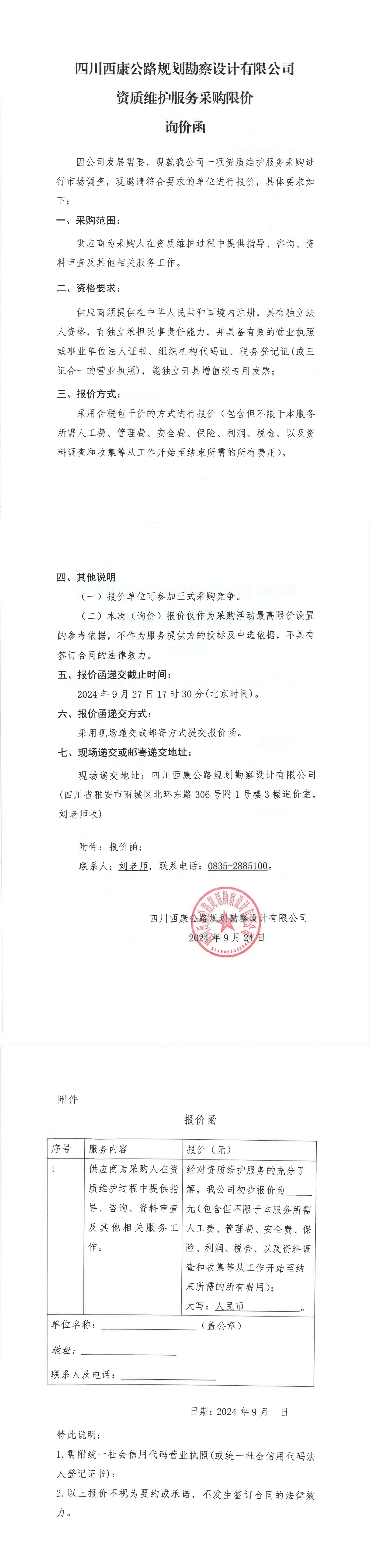 四川西康公路規(guī)劃勘察設(shè)計有限公司資質(zhì)維護服務(wù)采購限價詢價函