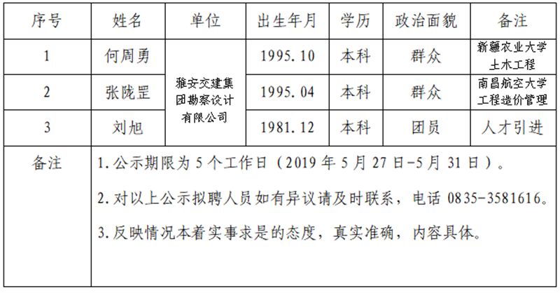 雅安交建集團(tuán)子公司擬聘用人員公示(路橋公司)