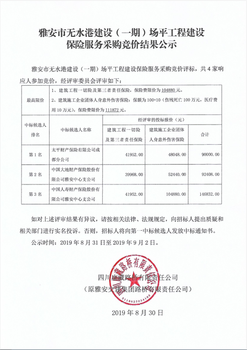 雅安市無水港建設(shè)(一期)場平工程建設(shè)保險(xiǎn)服務(wù)采購競價(jià)結(jié)果公示