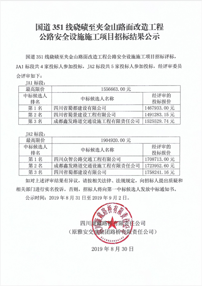 國道351線磽磧至夾金山路面改造工程公路安全設(shè)施施工項目招標結(jié)果公示