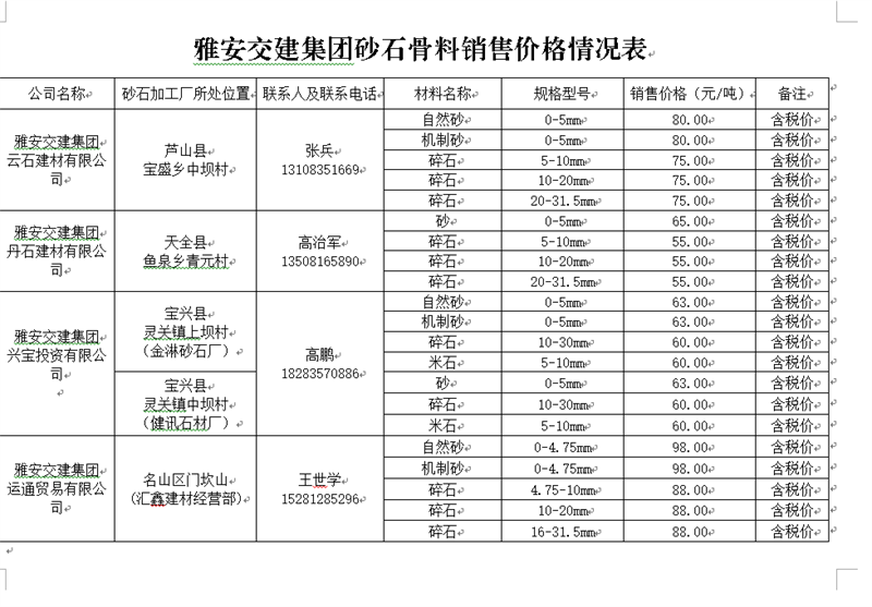 三、興寶投資有限公司。興寶公司是寶興縣人民政府指定寶興縣發(fā)展投資有限責任公司與雅安市交通建設(shè)(集團)有限責任公司共同組建的合資公司。目前,公司與兩家企業(yè)確定了代加工合作關(guān)系:一是寶興縣健迅石材廠;二是寶興縣金淋砂石有限公司;預計年生產(chǎn)能力約200萬噸。生產(chǎn)廠區(qū)距雨城區(qū)中心城區(qū)約55公里。