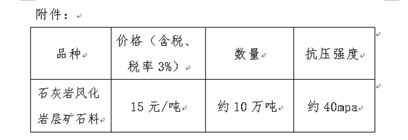 現將我公司礦山首采平臺的石灰?guī)r風化巖層礦石料定價出售事宜進行公示(見附件),經公司研究決定,定價出售風化巖層礦石料約10萬噸,現通過集團公司官網信息公示后對外銷售。報名客戶數不限,銷售方式為先款后貨,簽約銷售,銷售時間以礦山開采和生產計劃為準。