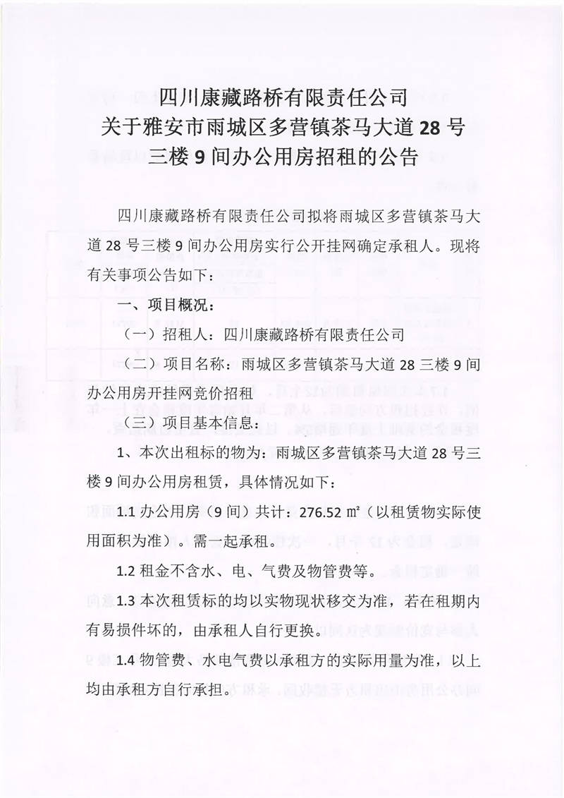 四川康藏路橋有限責(zé)任公司關(guān)于雅安市雨城區(qū)多營(yíng)鎮(zhèn)茶馬大道28號(hào)三樓9間辦公用房招租的公告