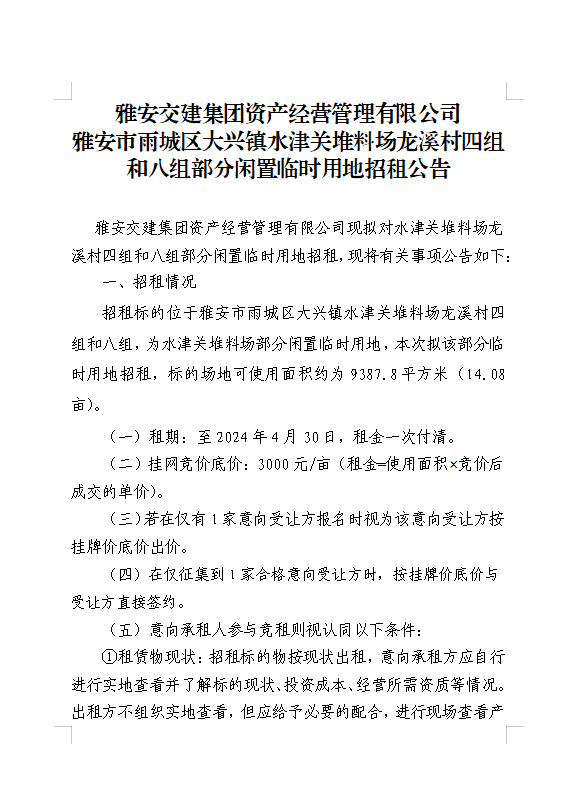 雅安交建集團(tuán)資產(chǎn)經(jīng)營管理有限公司雨城區(qū)大興鎮(zhèn)水津關(guān)堆料場龍溪村四組和八組部分閑置臨時(shí)用地招租公告