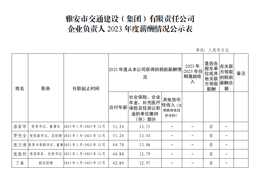 雅安市交通建設(shè)(集團)有限責(zé)任公司 企業(yè)負責(zé)人2023年度薪酬情況公示表