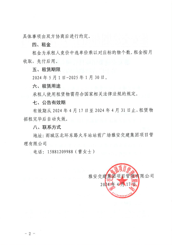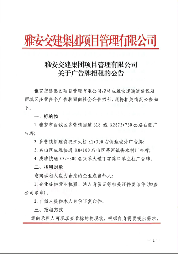 雅安交建集團(tuán)項(xiàng)目管理有限公司關(guān)于廣告牌招租的公告